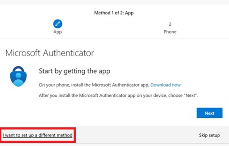 - After you have set up the first method, you will be asked to set up a second method of authentication.