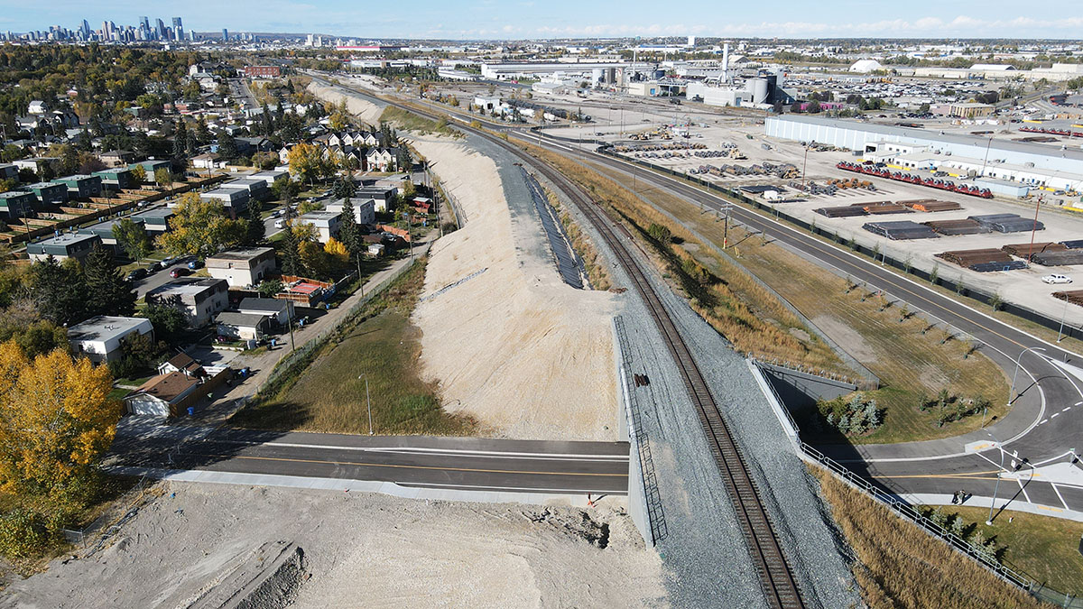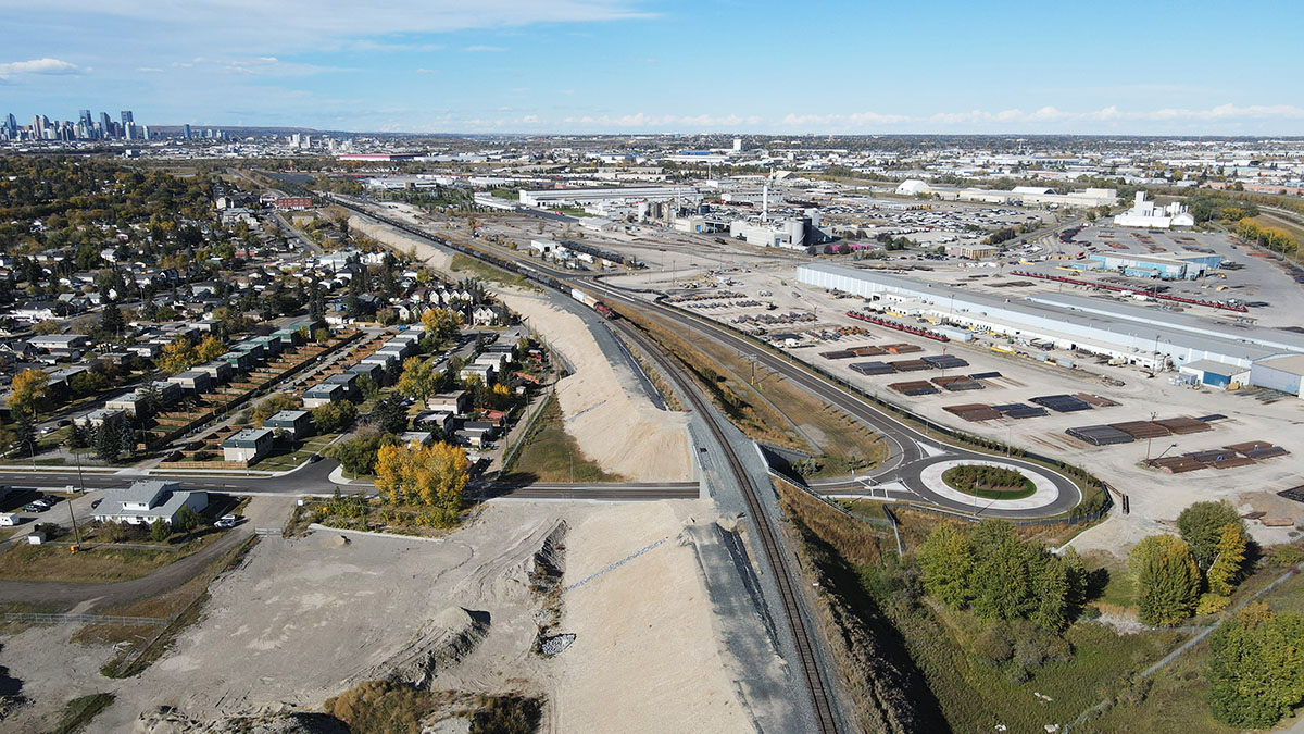 Looking north at 78 Avenue S.E. and the Canadian Pacific Kansas City (CPKC) railway line. The 78 Avenue LRT Bridge will cross 78 Avenue on the west side of the CPKC railway line.