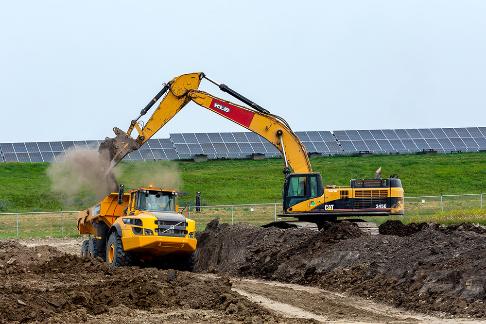 An excavator loads an articulated dump truck with topsoil in September 2025