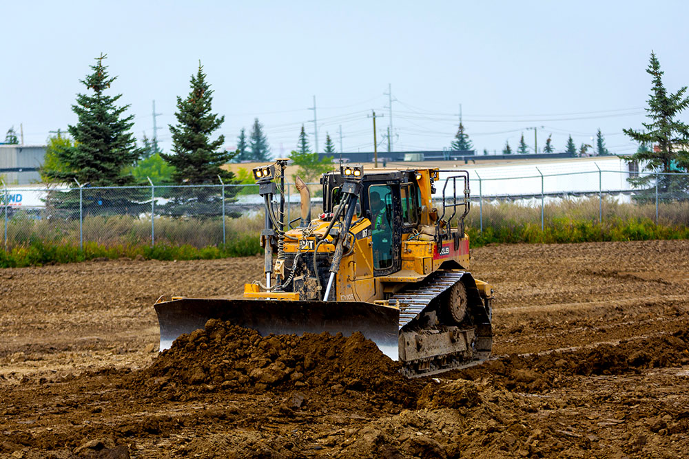 A bulldozer pushes topsoil in September 2025