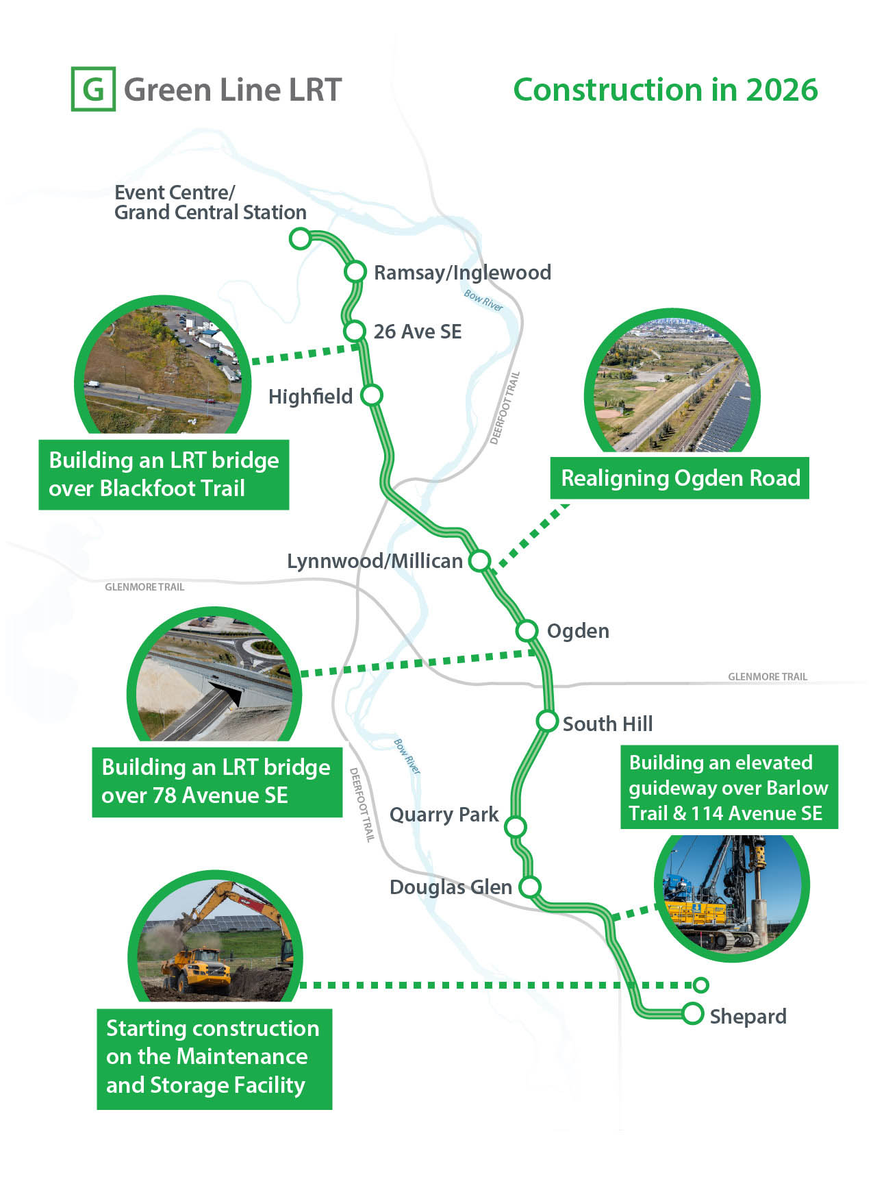 Construction on the Green Line LRT – SE Project began in June 2025 and will ramp up this year. Calgarians will see action mainly in the southernmost part of the route, between Shepard Station and the Bow River crossing (just north of Lynnwood/Millican Station), along with the Blackfoot Trail LRT Bridge project near Crossroads Market.