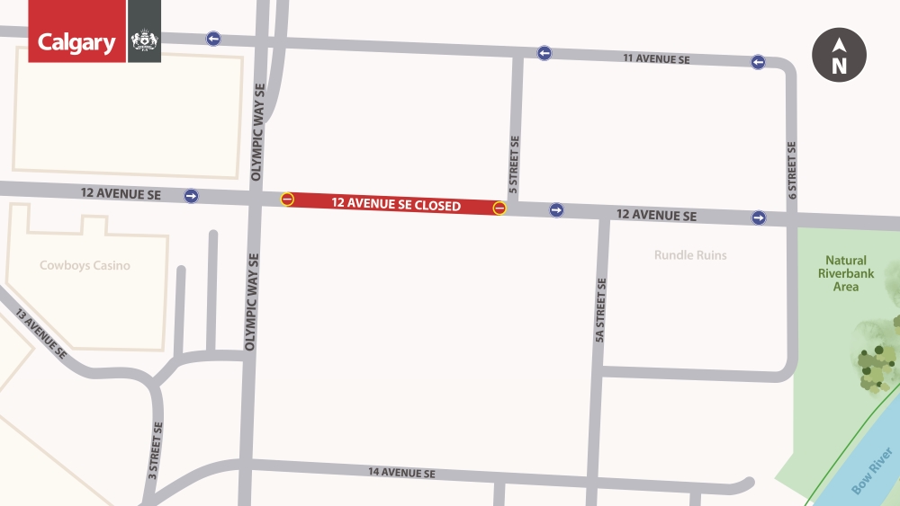 From the east on 12 Avenue S.E.: Vehicles will be detoured around the Scotia Place construction site by going south on 5A Street S.E., then west on 14 Avenue S.E., and north or south on Stampede Trail/Olympic Way S.E.