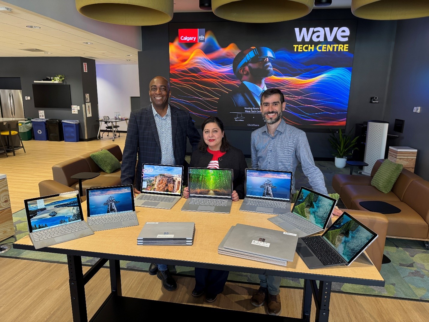Charles Buchanan from Technology Helps Foundation, Savera Hayat from United Way, and Luis Moura from The City’s Smart Cities team stand beside retired City computers. These computers are now part of the AHA Program. The photo was taken at The City's Wave Tech Centre in July 2025.