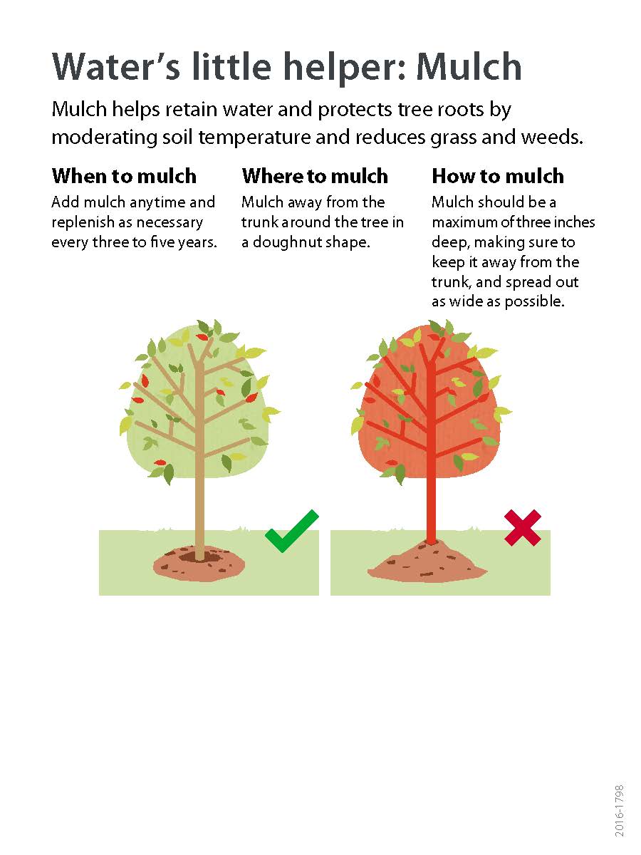 3. Add mulch away from the trunk around the tree in a donut shape. See Water’s Little Helper: Mulch for more info on how to properly use mulch.