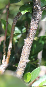 Oystershell scale is an introduced pest in Calgary. It has the appearance of small clusters of oyster-shaped “shells” that cover bark on shrubs and trees.
