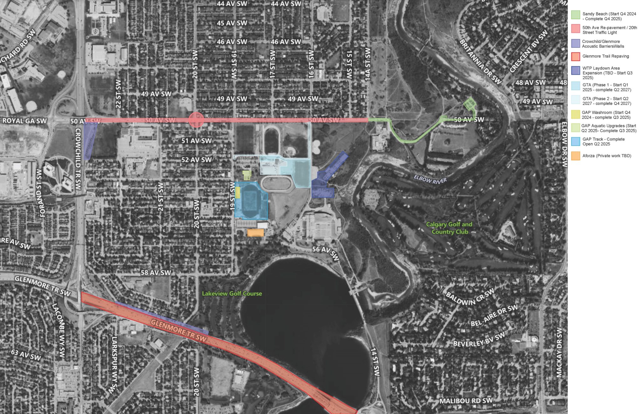These projects will deliver new twin-arena and track and field facilities at Glenmore Athletic Park, upgrade the 50 Avenue S.W. roadway from Crowchild Trail S.W. all the way into Sandy Beach Park (including parking lots), new multiuse pathways, resurface Glenmore Trail S.W. from Crowchild Trail S.W. to Elbow Drive S.W. and replace the noise barrier along Crowchild Trail from Glenmore Trail S.W. to 50 Ave S.W.