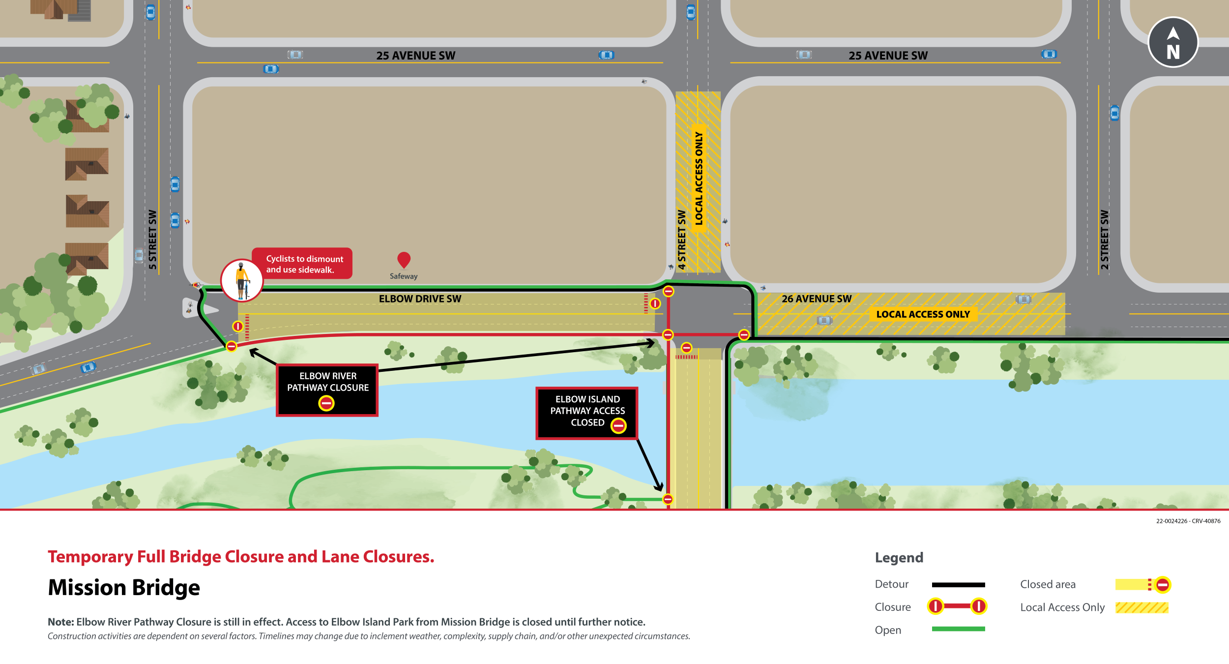 During this time, sections of Elbow Drive S.W., 4 Street S.W., and 26 Avenue S.W. will also be temporarily closed with local vehicle access maintained. In addition, pedestrian and wheeled user access will be maintained across the east side of Mission Bridge. Throughout the temporary road closures, pedestrian detours will be set up to cross 4 Street S.W. and 26 Avenue S.W.