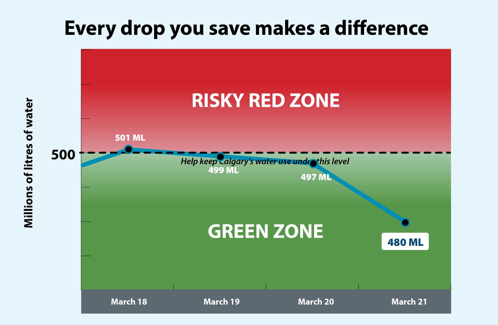 Yesterday’s water usage was 480 million litres (ML) which keeps us in the green zone for the third day in a row.