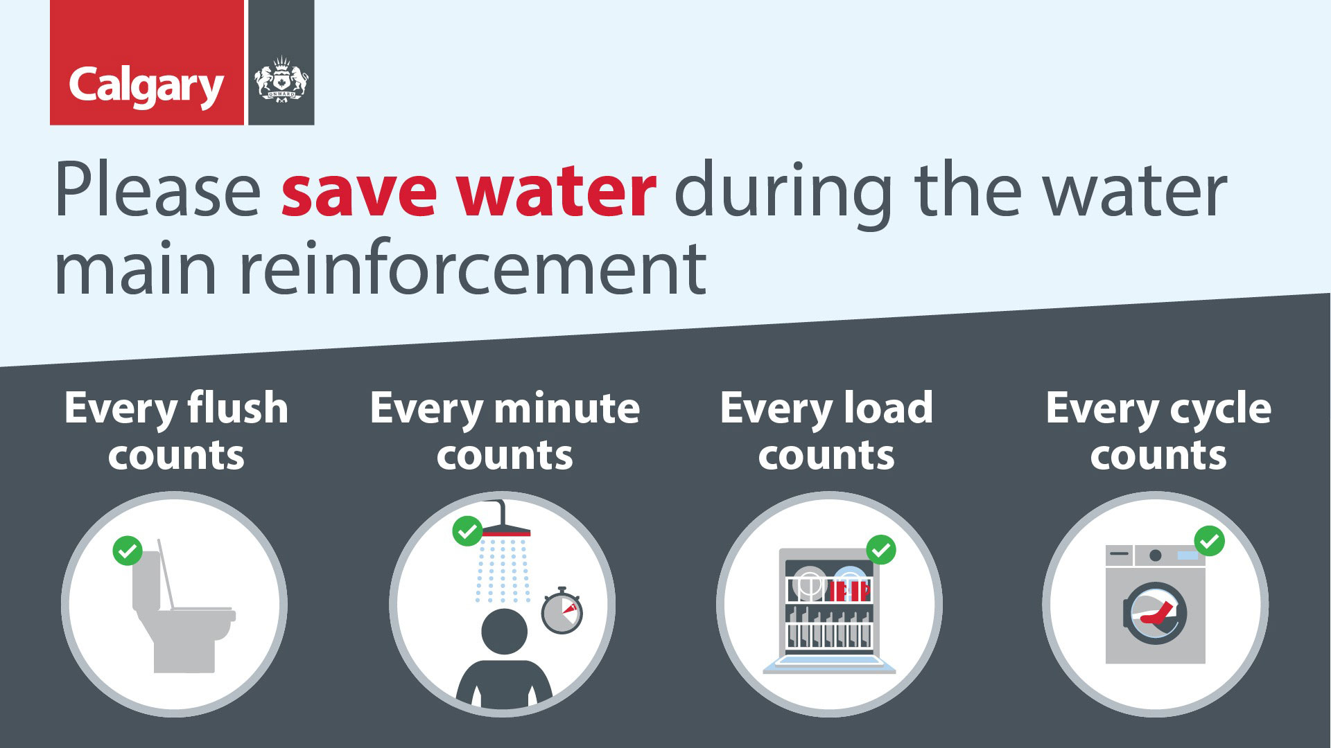 The Bearspaw South Feeder Main is shut down for reinforcement work beginning March 9, for approximately four weeks. During this time it's critical for residents and businesses to use less water since the Glenmore Water Treatment Plant is supplying most of the city and region and is operating at maximum capacity.