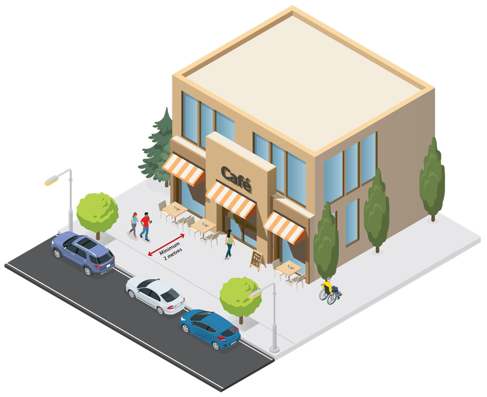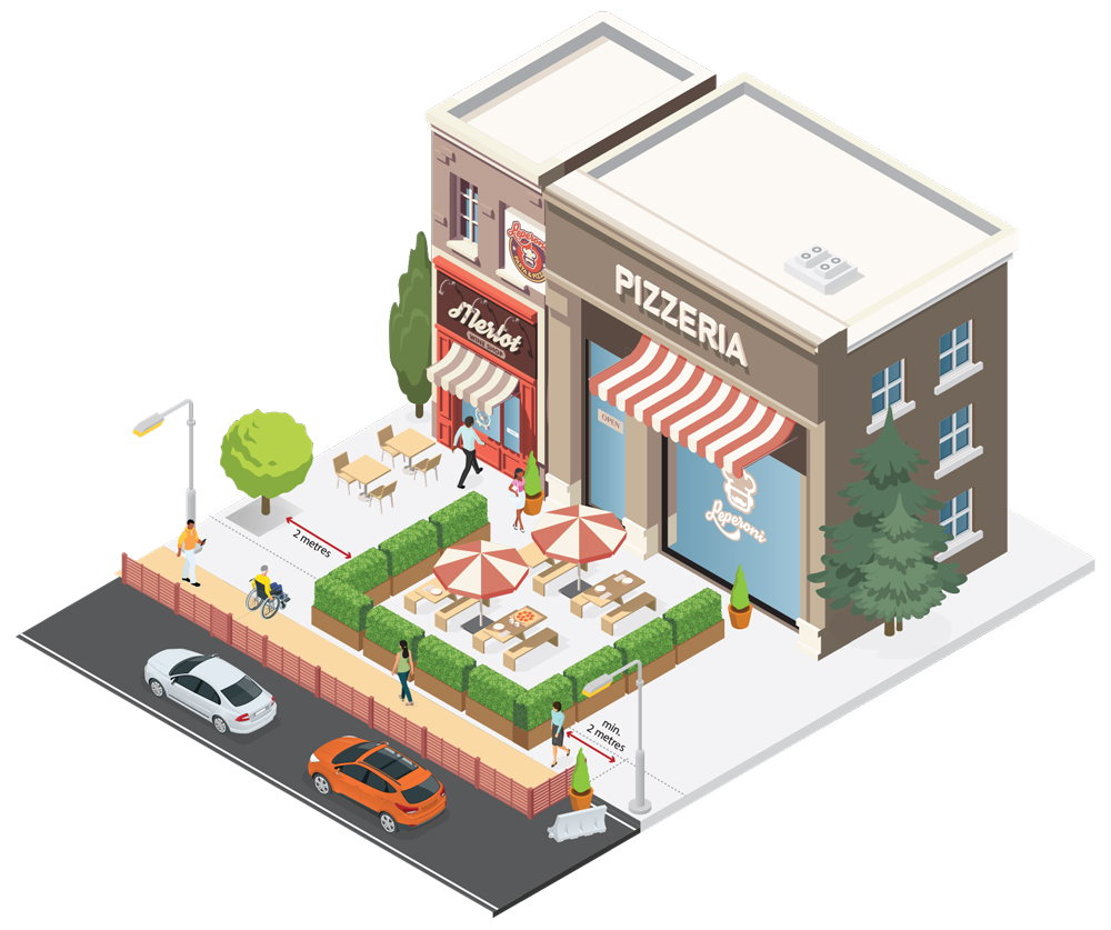 - Curbside patios must maintain a minimum of 2 metres of clearance from other adjacent patios, if extending beyond two parking spaces (beyond approximately 12 metres).